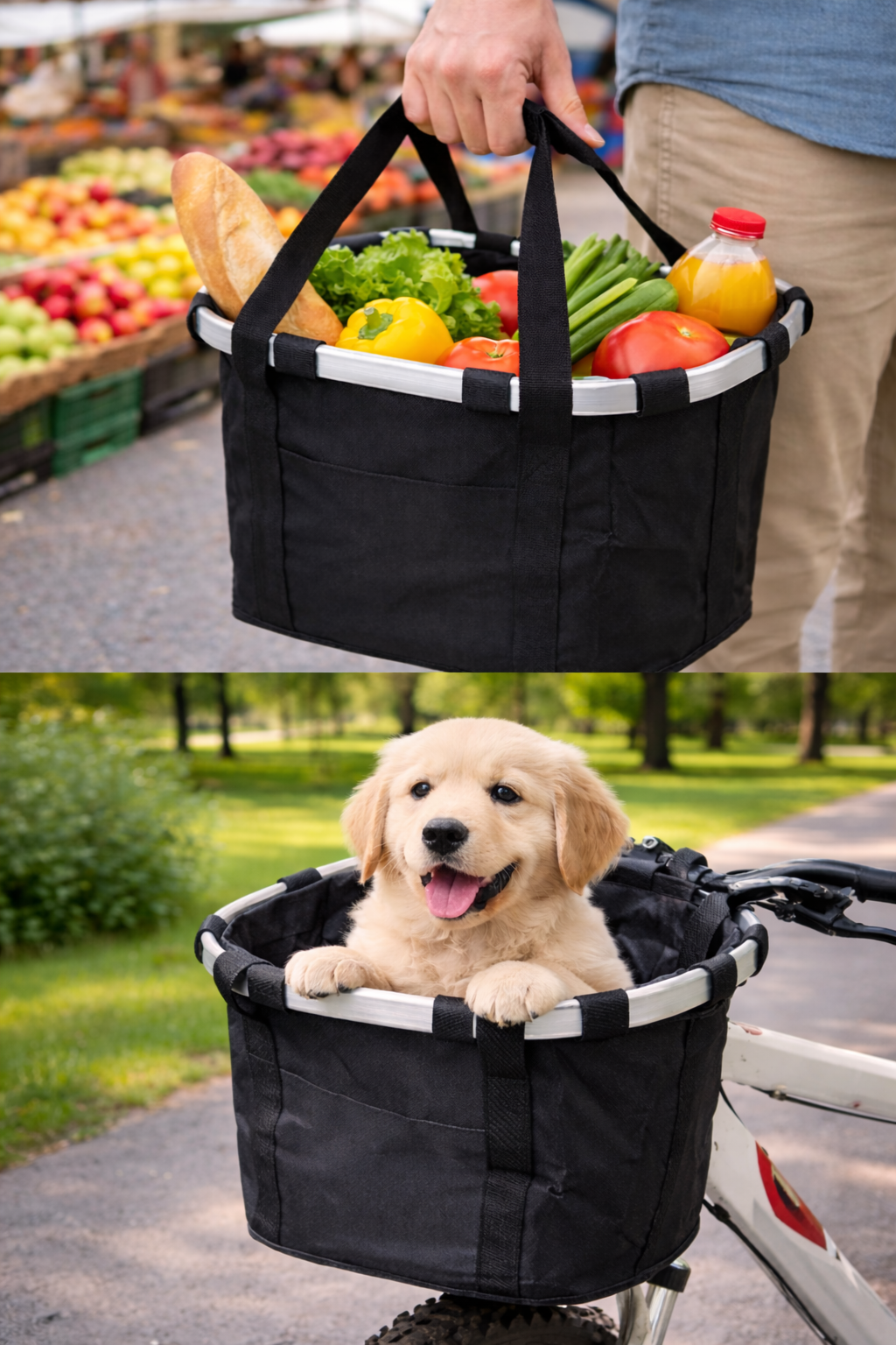 Apresentamos a BikeBag City, a cesta dobrável que se transforma em bolsa de transporte com alça destacável. Perfeita para quem usa a bicicleta no dia a dia e precisa de praticidade para levar compras, pertences pessoais ou até o seu pet de até 5kg nos passeios! 🐶💚