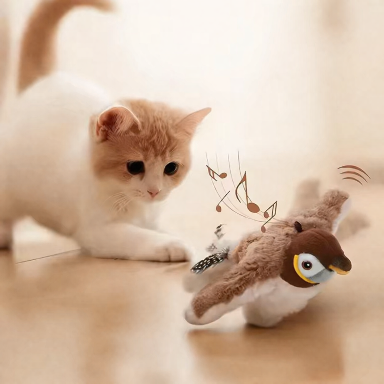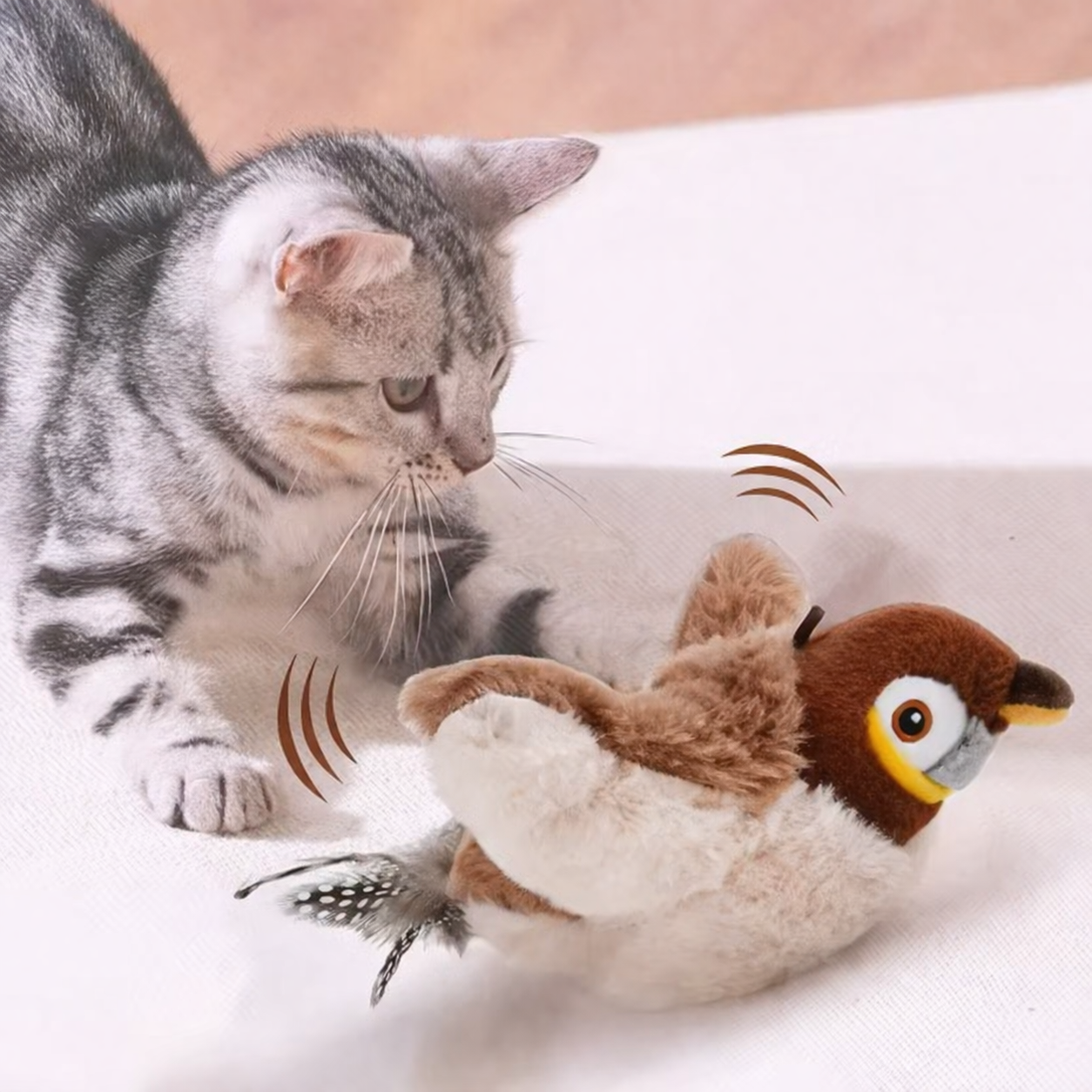 • 🐦 Movimento Realista: As asas se mexem, simulando um pássaro de verdade – desperta o instinto de caça do seu gato.